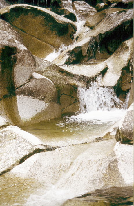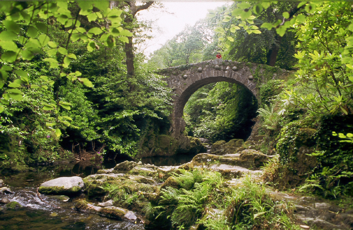 Wie dem auch sei, Start der Wanderung auf den Slieve Donard ist an ‚Bloody Bridge‘ (Donard Park), am südlichen Ortseingang. Der Weg ist gut ausgeschildert und beginnt auch recht harmlos durch den Park. Die ersten ca. 200 Höhenmeter gehen durch den Donard Forest, einen dichten Parkwald mit altem Baumbestand und üppigem Rhododendronwuchs. Man folgt dem Glen River und wenn auch die vielen kleinen Wasserfälle und Stromschnellen des Bachlaufes äußerst idyllisch wirken, erweist sich der Weg mit dem sehr felsigen und steilen Untergrund bald als ziemlich rauher, durchaus ‚alpiner‘ Track – mehrere Bachüberquerungen und ein Aufstieg durch eine steile ‚Klamm‘ machen das erste Mal stutzig – Sonntagsspaziergang?